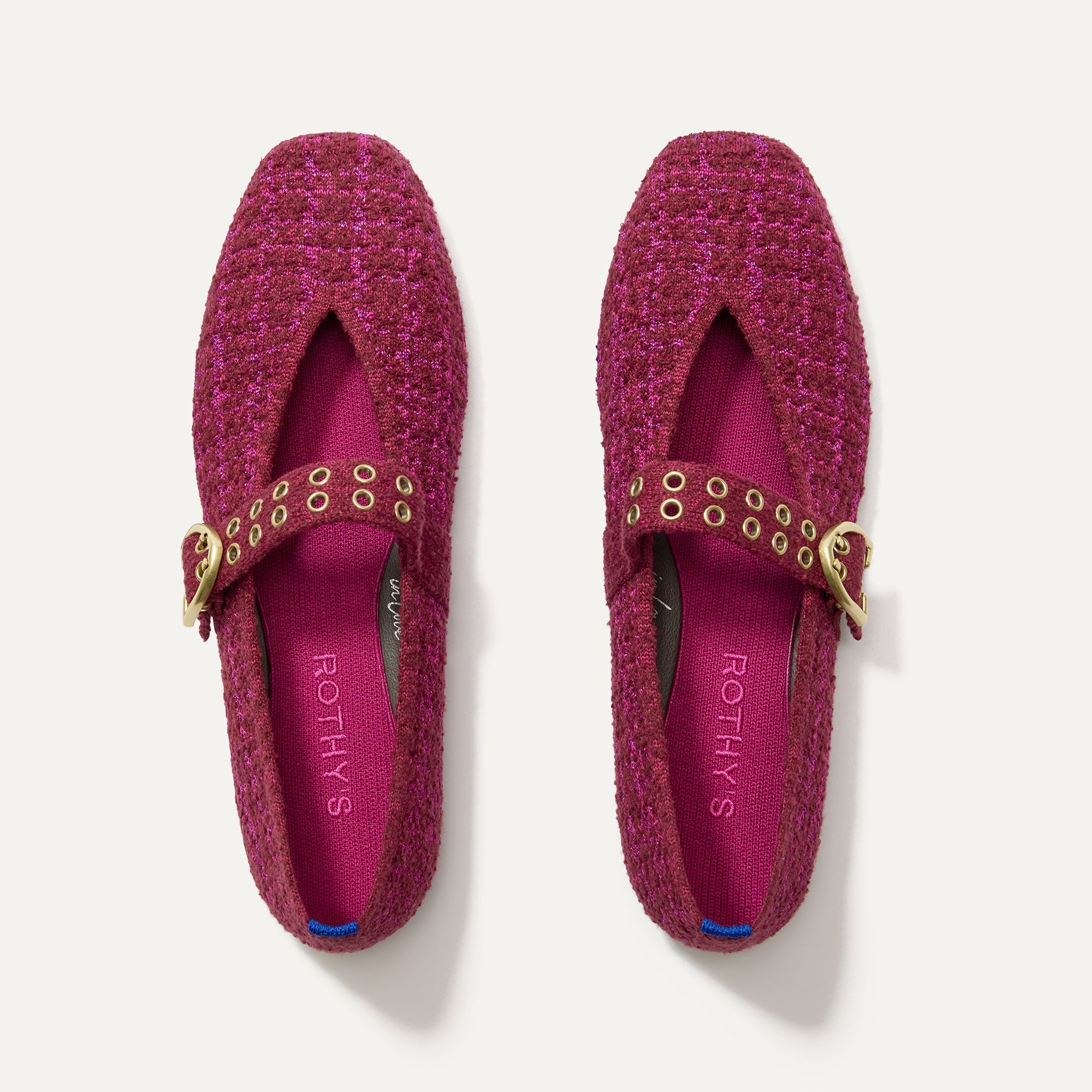 • Knit. flexible upper in a shimmery fuchsia tweed pattern.